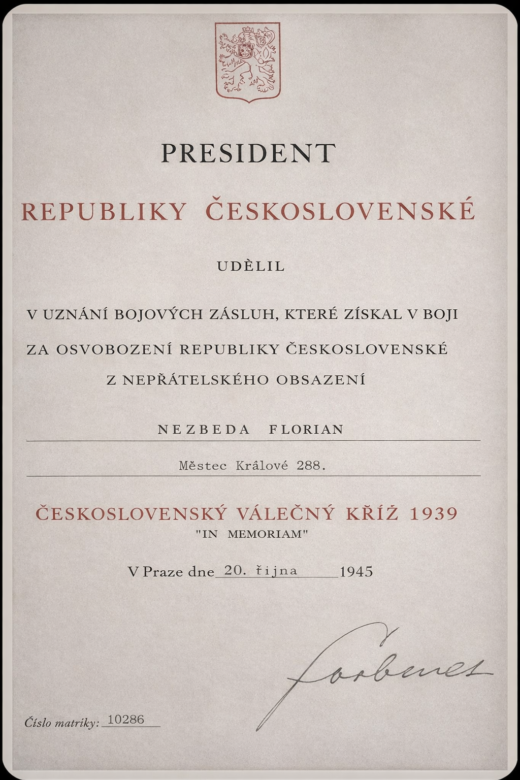 FLORIÁN NEZBEDA, narozen dne 22. srpna 1893 v Městci Králové.